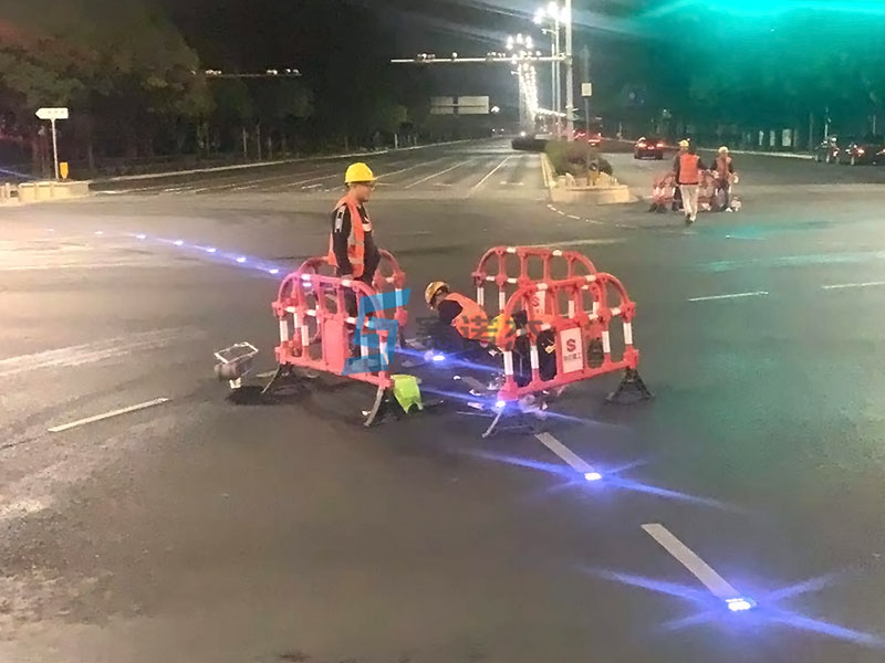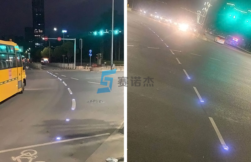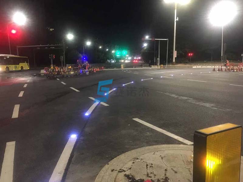 了解到這個(gè)難點(diǎn)與痛點(diǎn)以后,我司將原來給歐洲機(jī)場的一款發(fā)光有源道釘通過光學(xué)設(shè)計(jì)改型以后,用在深圳市紅荔路的6個(gè)主要十字路口,在接受信號(hào)機(jī)左拐綠燈信號(hào)后,通過白光形成導(dǎo)流線,較好地解決了十字路口導(dǎo)流線晚間亮度不夠的問題。