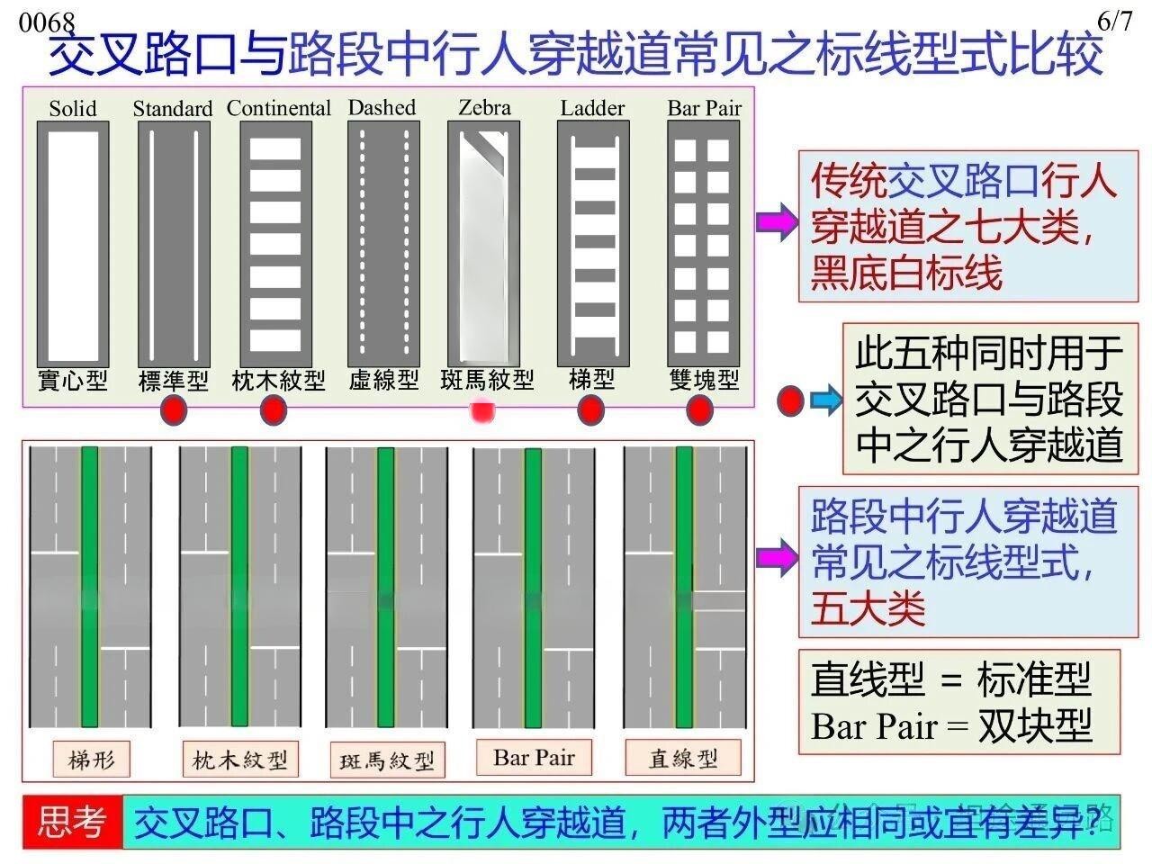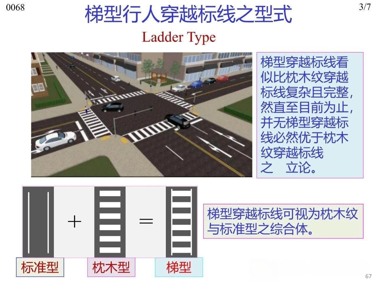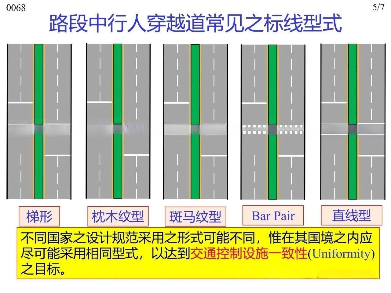 行人在橫穿道路時專供行人使用的人行橫道標線,主要分為平面交叉路口處與路段中兩類場景。其中,平面交叉路口與路段中均可使用梯型、枕木紋型、斑馬紋型、雙塊型(Bar Pair)、直線型(標準型)這五種型式,平面交叉路口傳統(tǒng)上可使用實心型、虛線型兩類。無論采用何種標線型式,全國范圍內或至少在同一城市內保持一致性,以實現交通控制設施的一致性(Uniformity)。