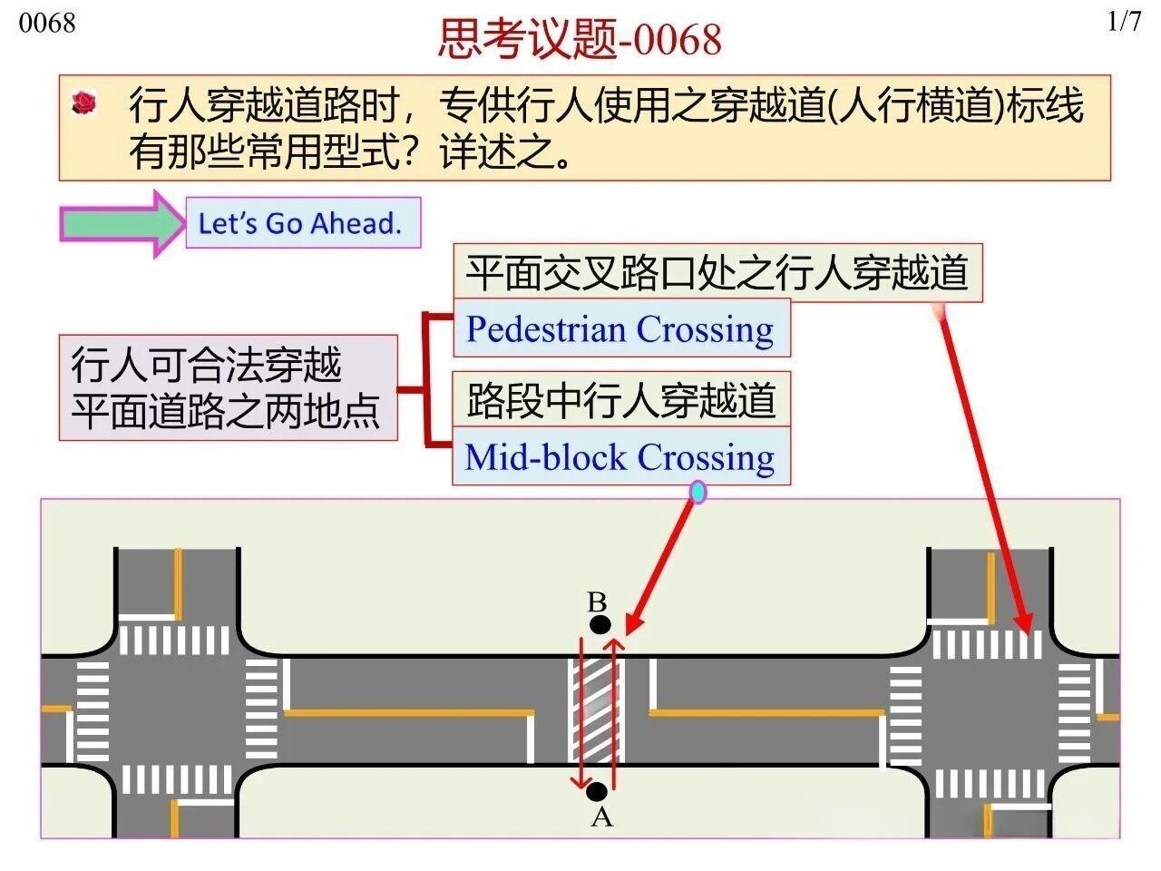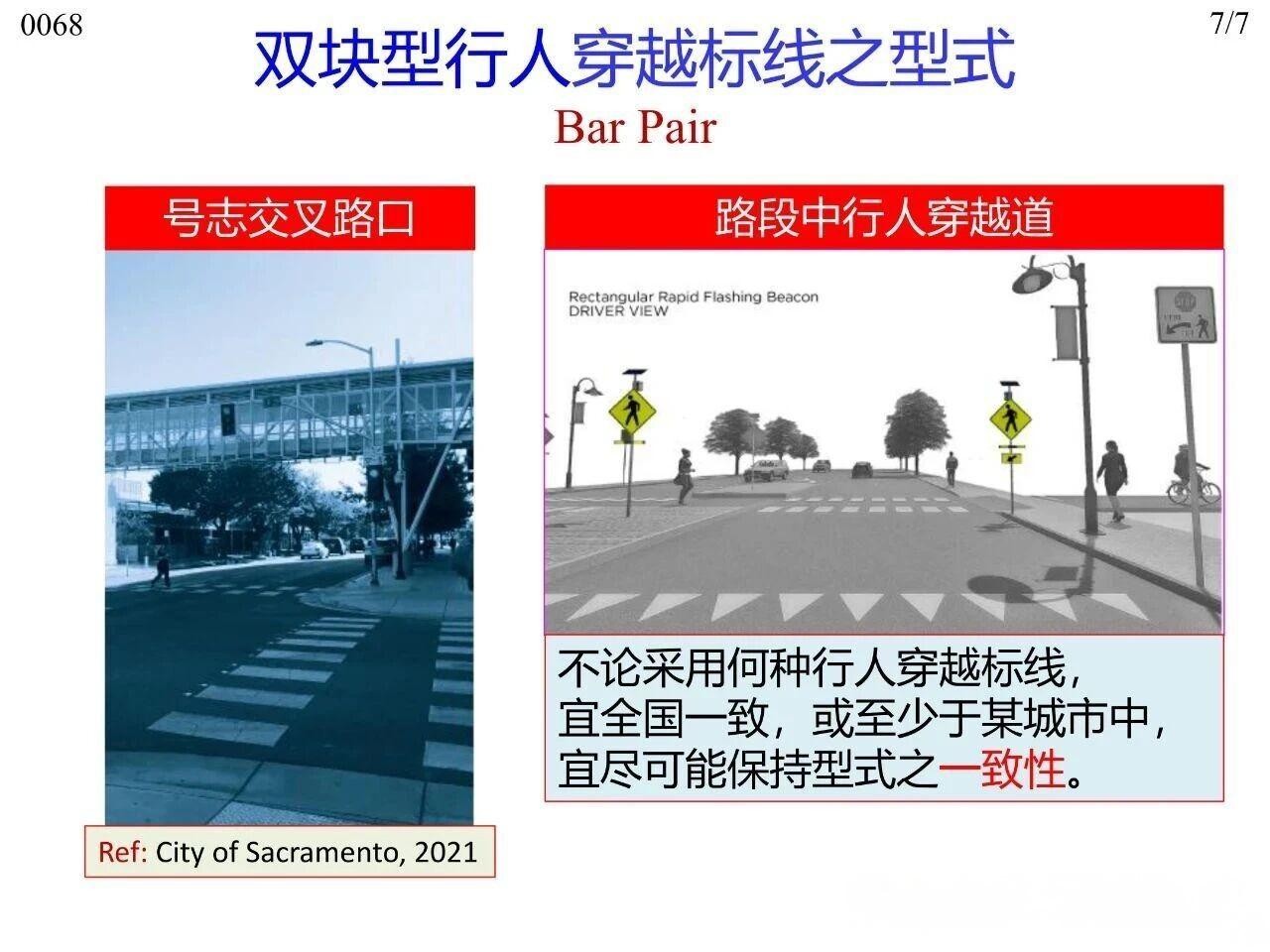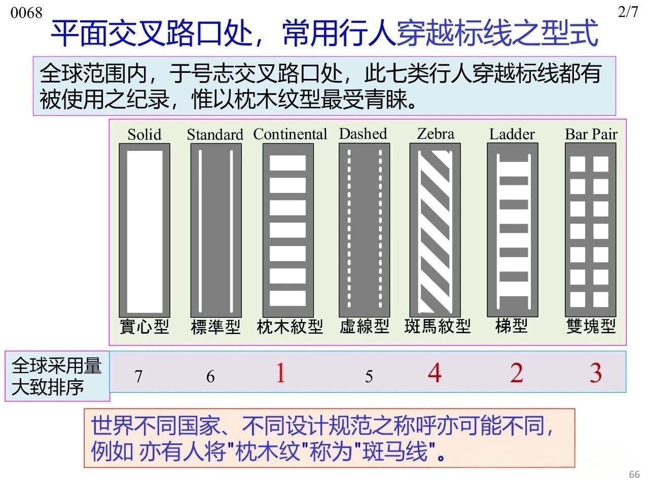 行人在橫穿道路時專供行人使用的人行橫道標線,主要分為平面交叉路口處與路段中兩類場景。其中,平面交叉路口與路段中均可使用梯型、枕木紋型、斑馬紋型、雙塊型(Bar Pair)、直線型(標準型)這五種型式,平面交叉路口傳統(tǒng)上可使用實心型、虛線型兩類。無論采用何種標線型式,全國范圍內或至少在同一城市內保持一致性,以實現交通控制設施的一致性(Uniformity)。