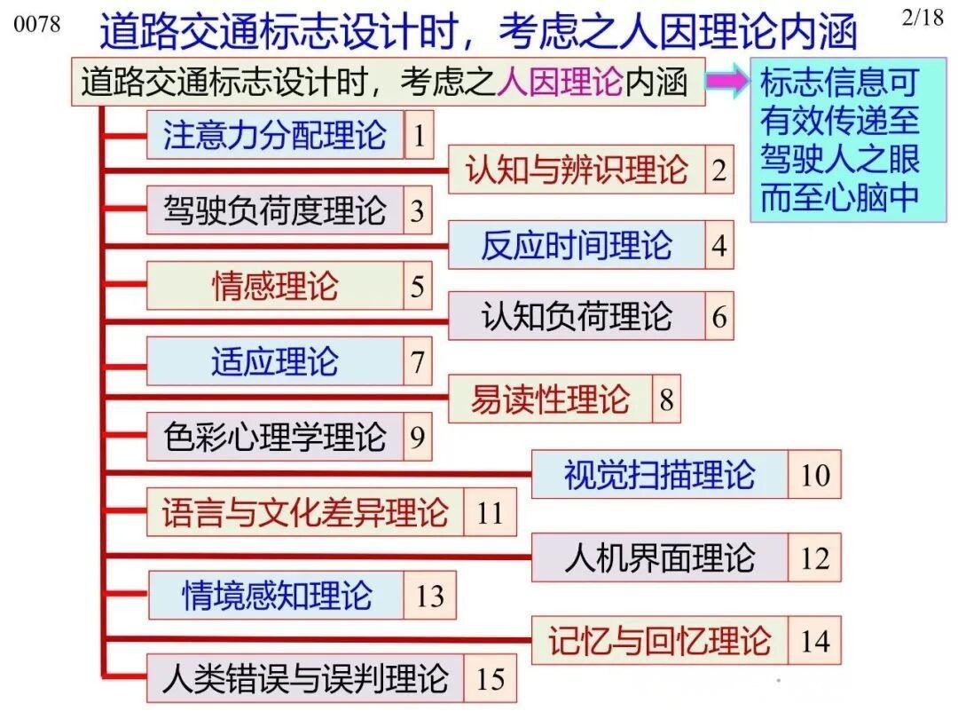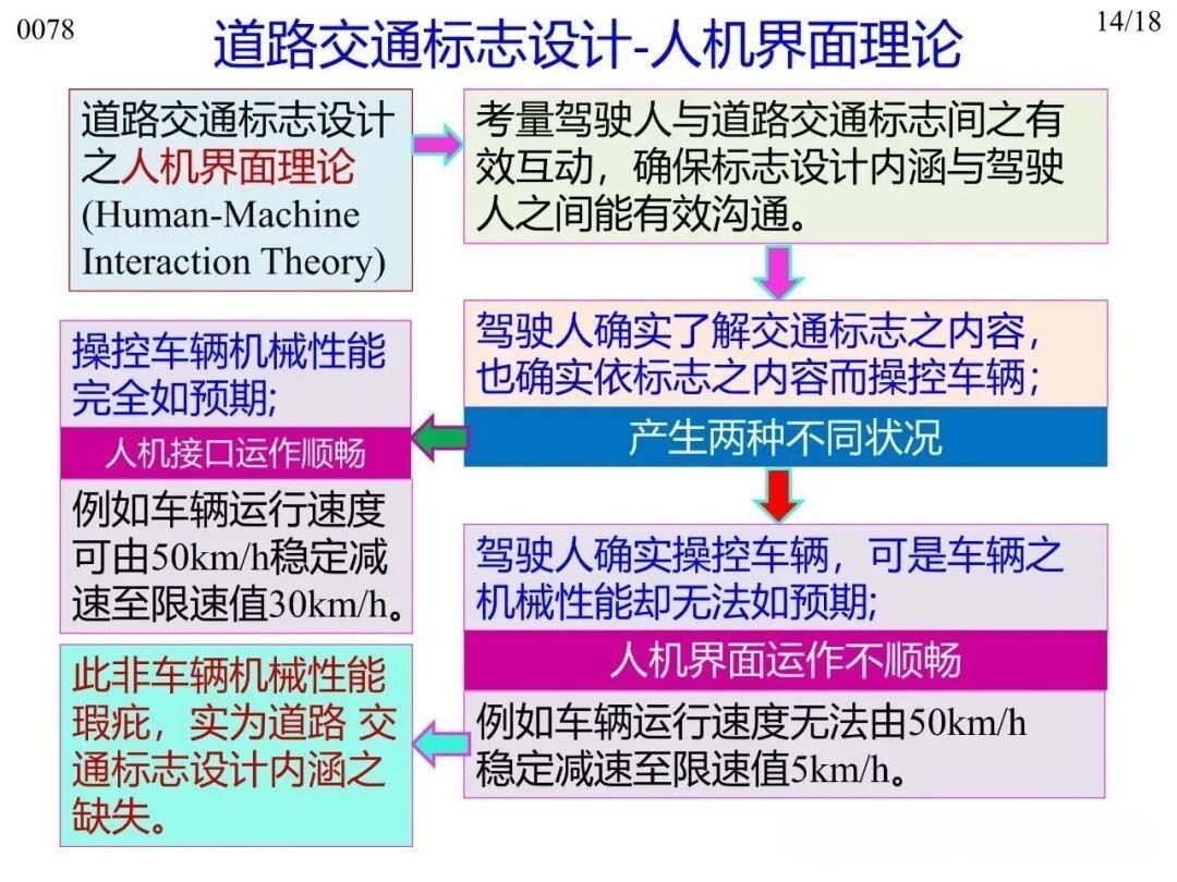12)人機(jī)交互理論(Human-Machine Interaction Theory): 駕駛?cè)伺c道路交通標(biāo)志需有效互動(dòng),確保駕駛?cè)死斫鈽?biāo)志,并以此為據(jù)操控車輛。“人機(jī)界面順暢”是指駕駛?cè)丝剀嚂r(shí),車輛機(jī)械性能符合預(yù)期。需避免:一是駕駛?cè)瞬倏剀囕v,車輛機(jī)械性能達(dá)不到預(yù)期;二是標(biāo)志設(shè)計(jì)缺失,導(dǎo)致駕駛?cè)宋窗窗踩蟛倏剀囕v,而不是車輛機(jī)械性能達(dá)不到安全要求;