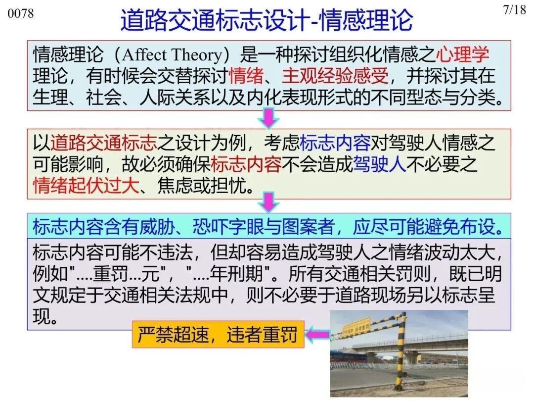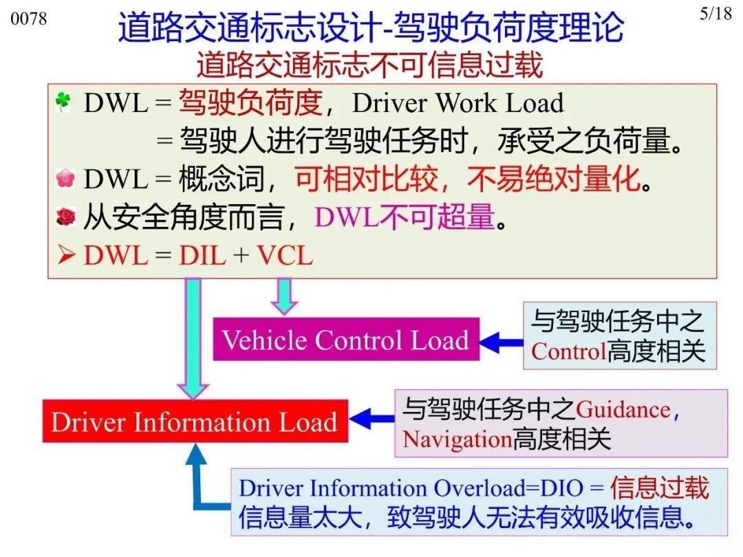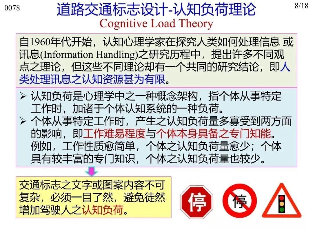 6)認(rèn)知負(fù)荷理論(Cognitive Load Theory):駕駛?cè)嗽隈{駛過程中處理信息的認(rèn)知資源極為有限,因此交通標(biāo)志的文字、圖符都應(yīng)一目了然,避免突然增加駕駛?cè)说恼J(rèn)知負(fù)荷;
