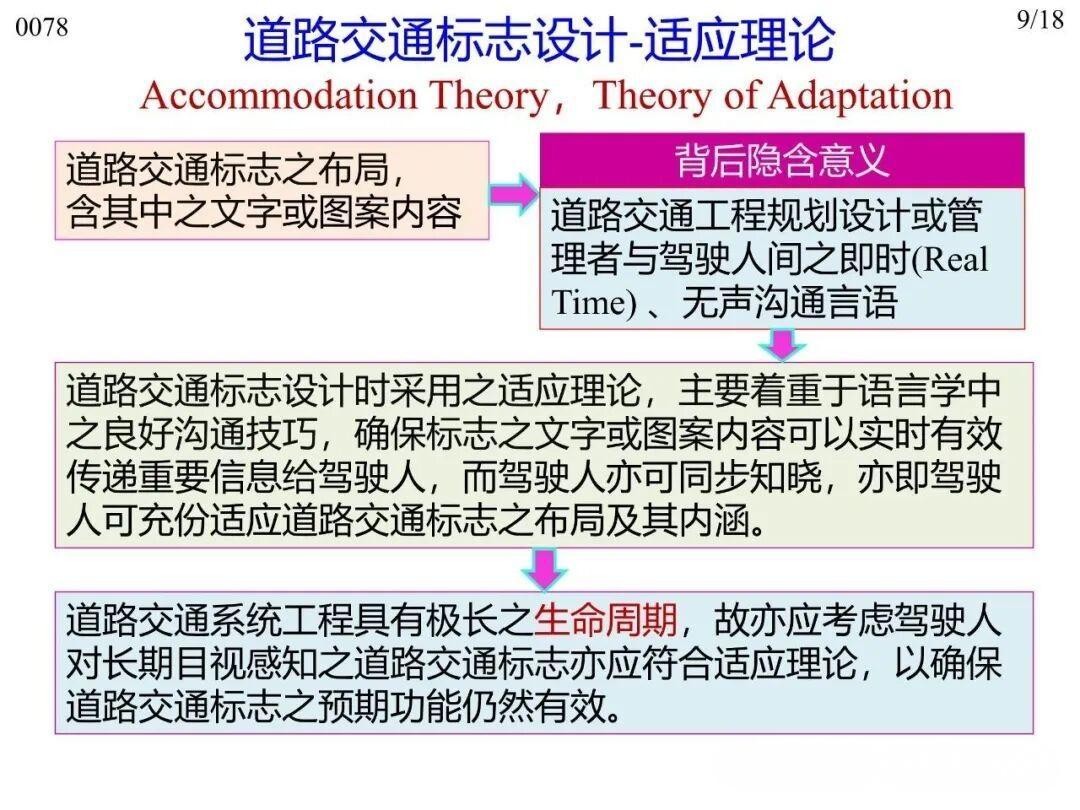 7)適應(yīng)理論(Accommodation Theory):標(biāo)志是無聲的信息傳遞工具,應(yīng)保障信息及時(shí)傳遞,保證駕駛?cè)碎L(zhǎng)期適應(yīng)標(biāo)志傳遞的信息;