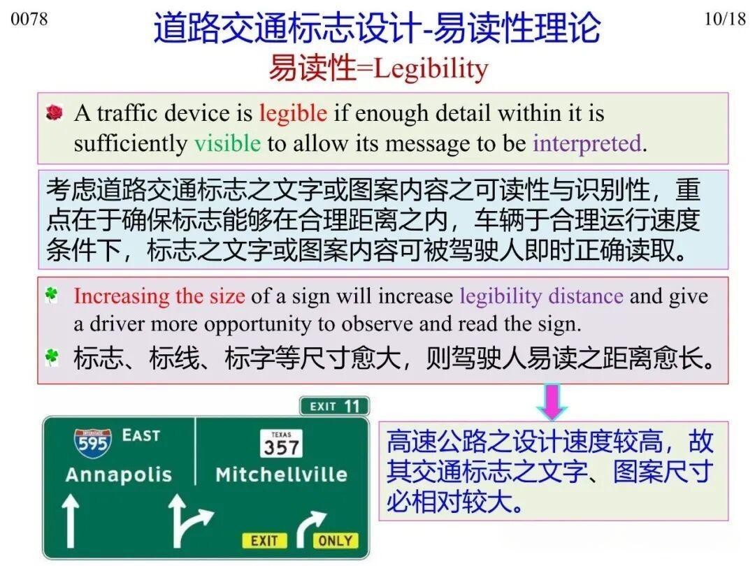 8)易讀性理論(Legibility Theory):設(shè)計(jì)應(yīng)確保在合理距離、車輛合理運(yùn)行速度條件下,駕駛?cè)四芗皶r(shí)正確讀取標(biāo)志的文字或圖符;