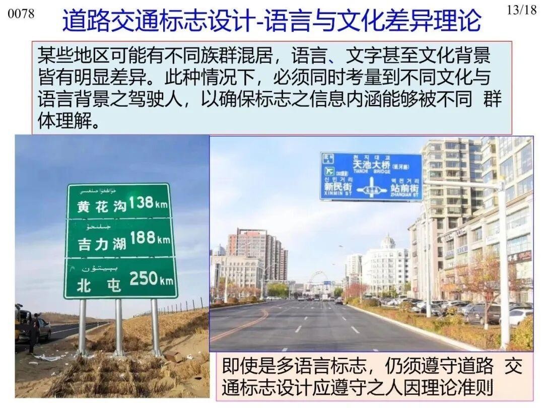 11)語(yǔ)言與文化差異理論:針對(duì)多民族混居、語(yǔ)言文字及文化背景存在明顯差異的地區(qū),設(shè)計(jì)時(shí)應(yīng)考慮不同文化與語(yǔ)言背景的駕駛?cè)耍捎枚嗾Z(yǔ)言標(biāo)志,確保標(biāo)志的信息內(nèi)涵能被各類群體理解。同時(shí),也要嚴(yán)格遵守標(biāo)志設(shè)計(jì)應(yīng)遵循的人因理論,不可因語(yǔ)言差異忽視設(shè)計(jì)規(guī)范;