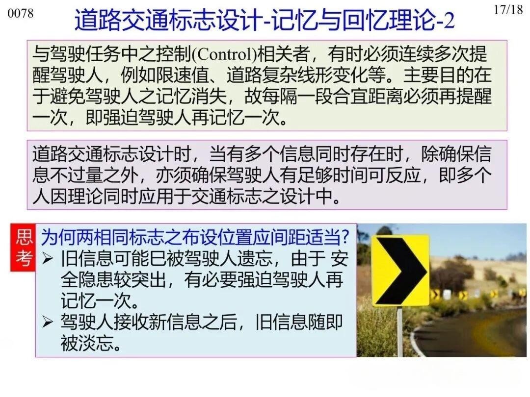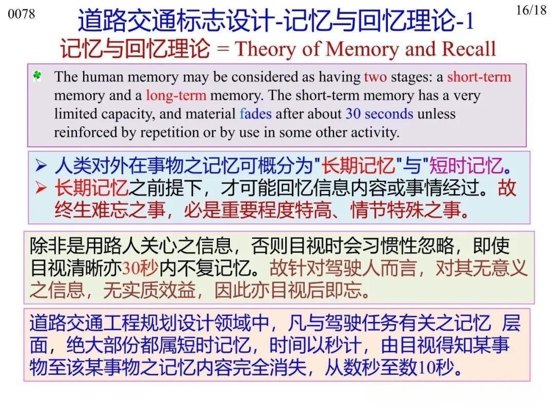 14)記憶與回憶理論(Theory of Memory and Recall):人類記憶分短時(shí)記憶和長(zhǎng)期記憶,設(shè)計(jì)時(shí),限速、道路復(fù)雜線形等需連續(xù)提醒的內(nèi)容,需間隔合適距離重復(fù)設(shè)置,避免駕駛?cè)硕虝r(shí)記憶產(chǎn)生的遺忘,重新喚起短時(shí)記憶;