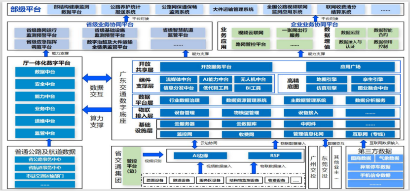 首先仍以數(shù)字底座為依托,該底座具有三大特點(diǎn):一是構(gòu)建分層解耦體系,以固定技術(shù)形態(tài)應(yīng)對(duì)多變業(yè)務(wù)需求;二是堅(jiān)持?jǐn)?shù)據(jù)為本,通過(guò)《廣東交通數(shù)字底座暫行技術(shù)規(guī)定》《廣東交通數(shù)字底座公路數(shù)據(jù)接入暫行技術(shù)規(guī)定》兩份文件(且文件持續(xù)更新迭代),推動(dòng)數(shù)據(jù)標(biāo)準(zhǔn)化與統(tǒng)一;三是實(shí)現(xiàn)能力共享,對(duì)AI、地圖、低空等共性技術(shù)與資源采用統(tǒng)一供給模式。