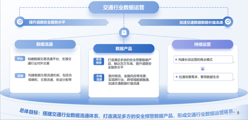 綜上,當(dāng)前工作圍繞“聚力數(shù)據(jù)運(yùn)營(yíng),夯實(shí)道路安全根基;暢通數(shù)據(jù)價(jià)值,加速交通數(shù)據(jù)賦能”展開(kāi),無(wú)論是數(shù)據(jù)供給方、使用方還是加工方,均可參與其中。期待各方共同推動(dòng)數(shù)據(jù)市場(chǎng)繁榮,助力智慧交通發(fā)展。