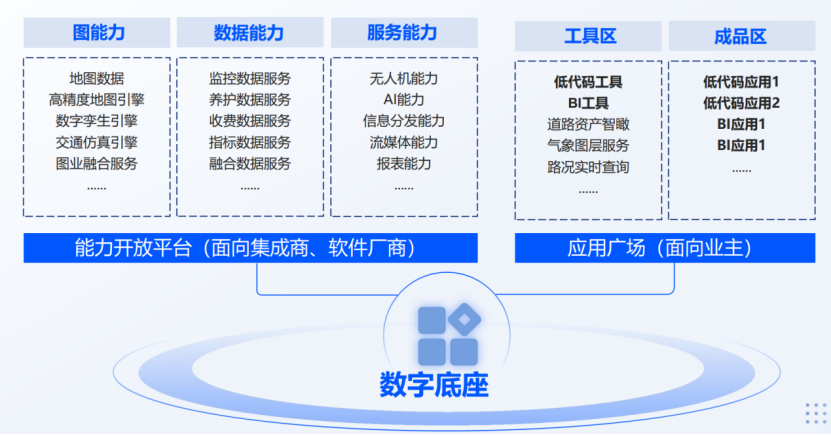 數(shù)字底座以多元數(shù)據(jù)為基礎(chǔ)、開(kāi)放能力為支撐,不僅服務(wù)于智慧公路,還為其他創(chuàng)新應(yīng)用提供保障,助力行業(yè)數(shù)字化轉(zhuǎn)型。