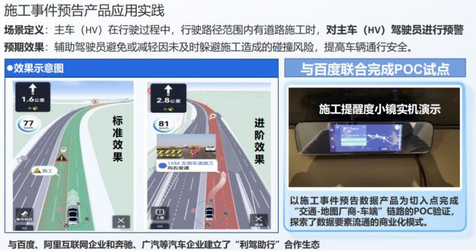 以施工事件預(yù)告產(chǎn)品為例,高速公路的臨時(shí)施工與計(jì)劃施工信息對(duì)駕駛安全至關(guān)重要,通過(guò)匯集施工時(shí)間、地點(diǎn)、回避方案等數(shù)據(jù),形成標(biāo)準(zhǔn)化數(shù)據(jù)產(chǎn)品,可有效降低因司機(jī)對(duì)施工信息不知情引發(fā)的事故風(fēng)險(xiǎn)。